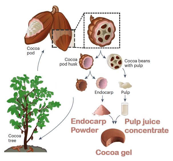 The cocoa gel is made of the inner fiber of the cocoa pod husk and of pulp juice concentrate.